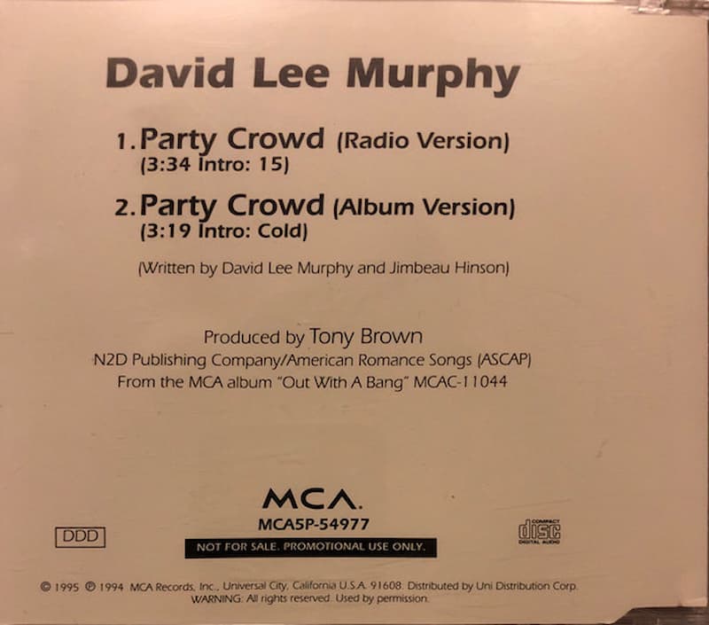 “Party Crowd” is a song co-written and recorded by American country music artist David Lee Murphy. It was released in February 1995 as the third single from his debut album Out with a Bang. It peaked at number 6 in the United States, and number 7 in Canada, thus becoming his first top ten hit. The song was written by Murphy and Jimbeau Hinson.