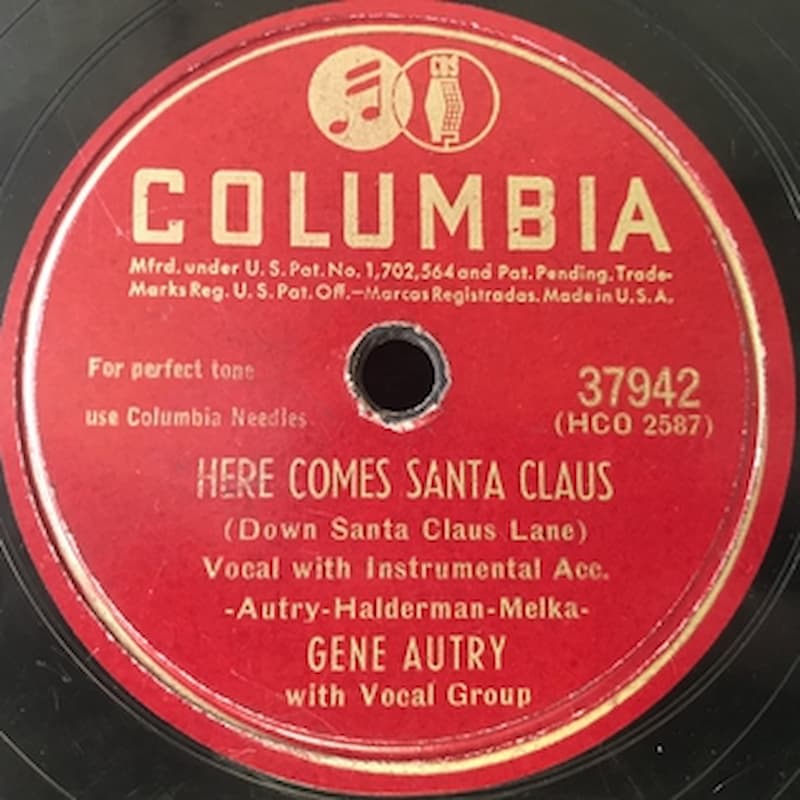 “Here Comes Santa Claus (Right Down Santa Claus Lane)” is a Christmas song first recorded by Gene Autry for Columbia Records in 1947. Most publishing sources credit the song to Gene Autry and Oakley Haldeman, though some later references also list Harriet Melka as a co-writer. Autry cut the master at Columbia’s Hollywood studios on August 28, 1947, and Columbia issued it that autumn as single 37942, pairing “Here Comes Santa Claus (Right Down Santa Claus Lane)” with “An Old Fashioned Tree” on the flip side. Copyright entries show the song being published in November 1947 through Gene Autry’s own music publishing company.