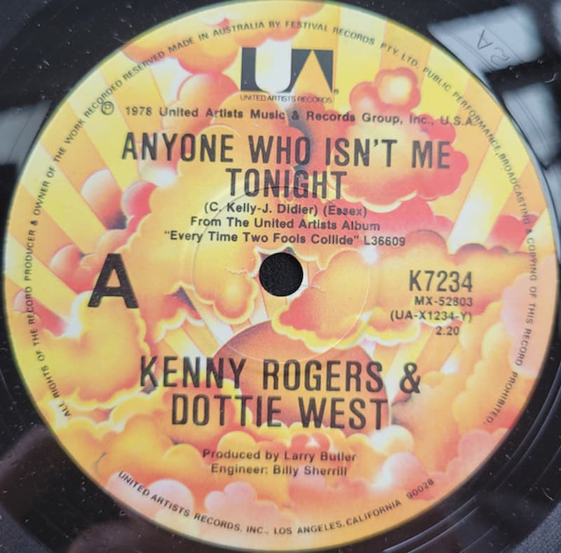 “Anyone Who Isn’t Me Tonight” is a duet recorded by Kenny Rogers and Dottie West and released in August 1978 as the second single from their collaborative album Every Time Two Fools Collide. Written by Julie Didier and Casey Kelly, the track was produced by Larry Butler and recorded at Jack Clement Recording Studio in Nashville. The single followed the commercial success of the pair’s earlier collaboration and helped cement Rogers and West as a regular duet partnership in country music during the late 1970s.