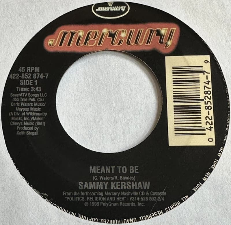 “Meant to Be” is a song written by Chris Waters and Rick Bowles, recorded by American country music artist Sammy Kershaw, and released in March 1996 as the first single from his fourth studio album Politics, Religion and Her on Mercury Records. The song peaked at No. 5 on the Billboard Hot Country Singles & Tracks chart and No. 4 on the Canadian RPM Country Tracks chart, marking a strong start for the album’s promotional cycle.